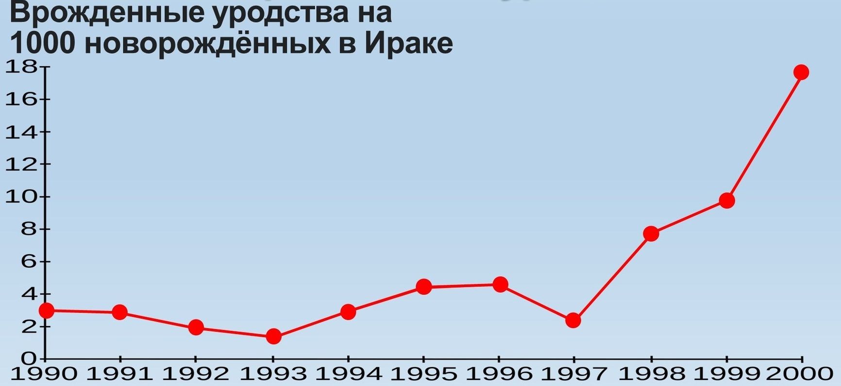 Другой график, продемонстрированный Кирилловым, показывает резкий рост количества врожденных уродств в Ираке, начиная с 1998 года. Проиллюстрирован он настолько пугающими фотографиями младенцев с врожденными дефектами, что мы не решаемся здесь их привести.