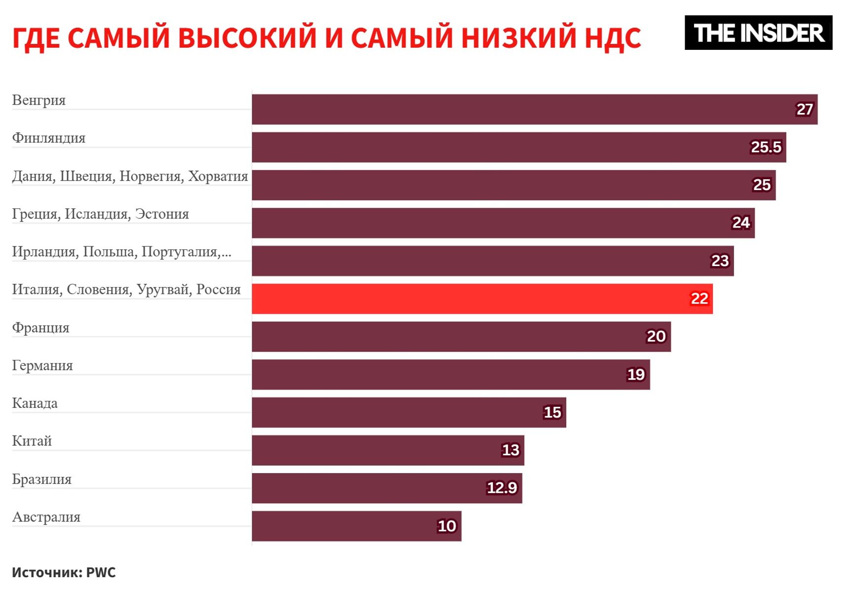 Этим повышением Россия догонит и сразу обгонит Испанию и Нидерланды (ставка налога там 21%), а также оторвется от Франции, Британии, Турции (20%) и Германии (19%). В США такого налога и аналогов нет вообще. В Канаде ставки различаются по провинциям, но все не более 15%. В Японии, Южной Корее и Австралии — 10%. В развивающихся странах ставка НДС, как правило, тоже ниже, чем в России: в Индии и Пакистане — 18%, в Мексике — 16%, в ЮАР — 15%, в КНР — 13%, в Индонезии — 12%.