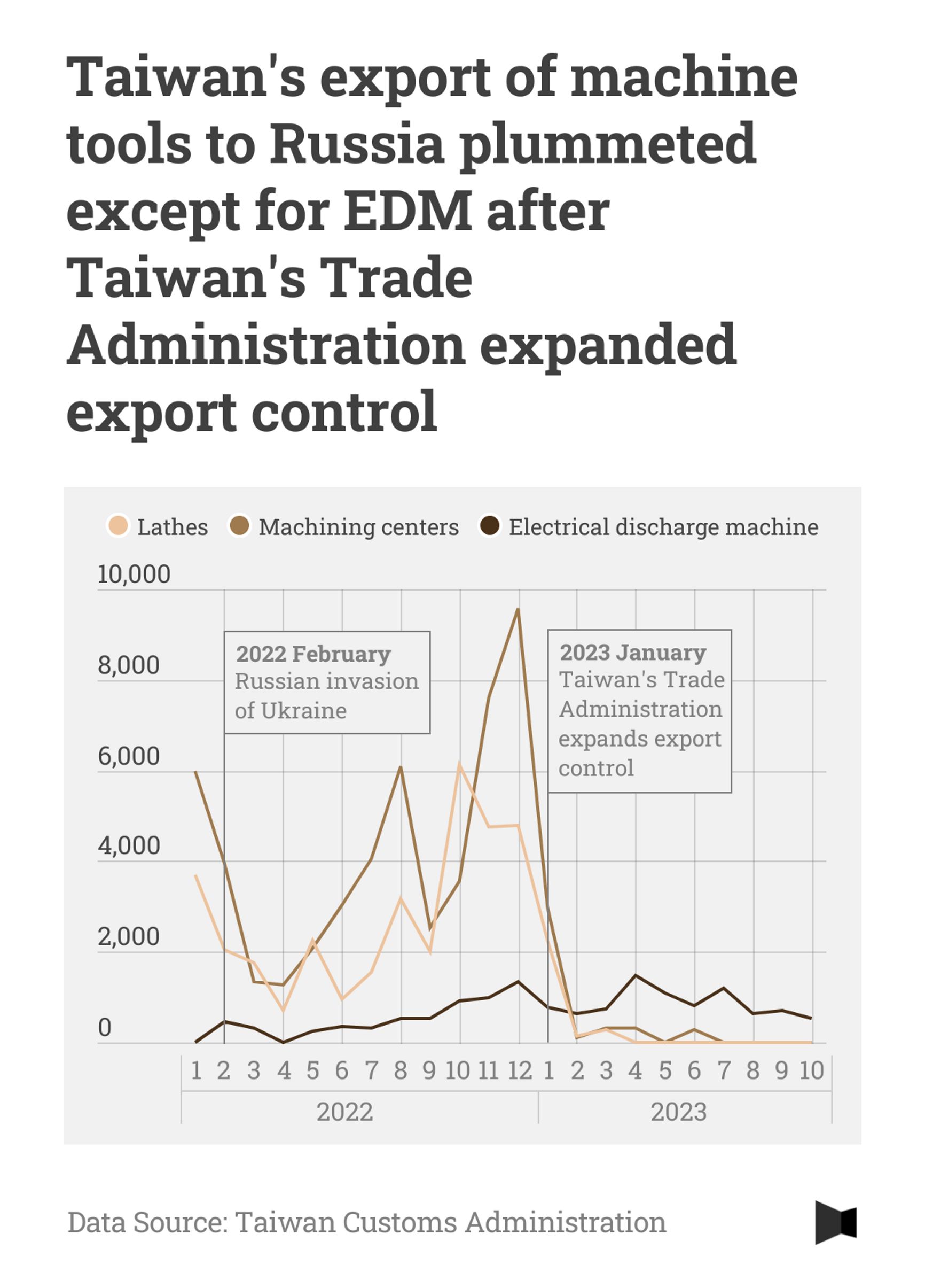 In January 2023, Taiwan’s Ministry of Economic Affairs finally took action, expanding the sanctions list to include the kinds of high-end machine tools Russia had legally been buying up for nearly a full year after the start of its unprovoked invasion. Following this policy switch, Taiwan's direct exports to Russia of complex machining machines and high-end lathes dropped almost to zero, leaving only loosely controlled electrical discharge machines available for purchase by Russian customers. But the story does not end there.