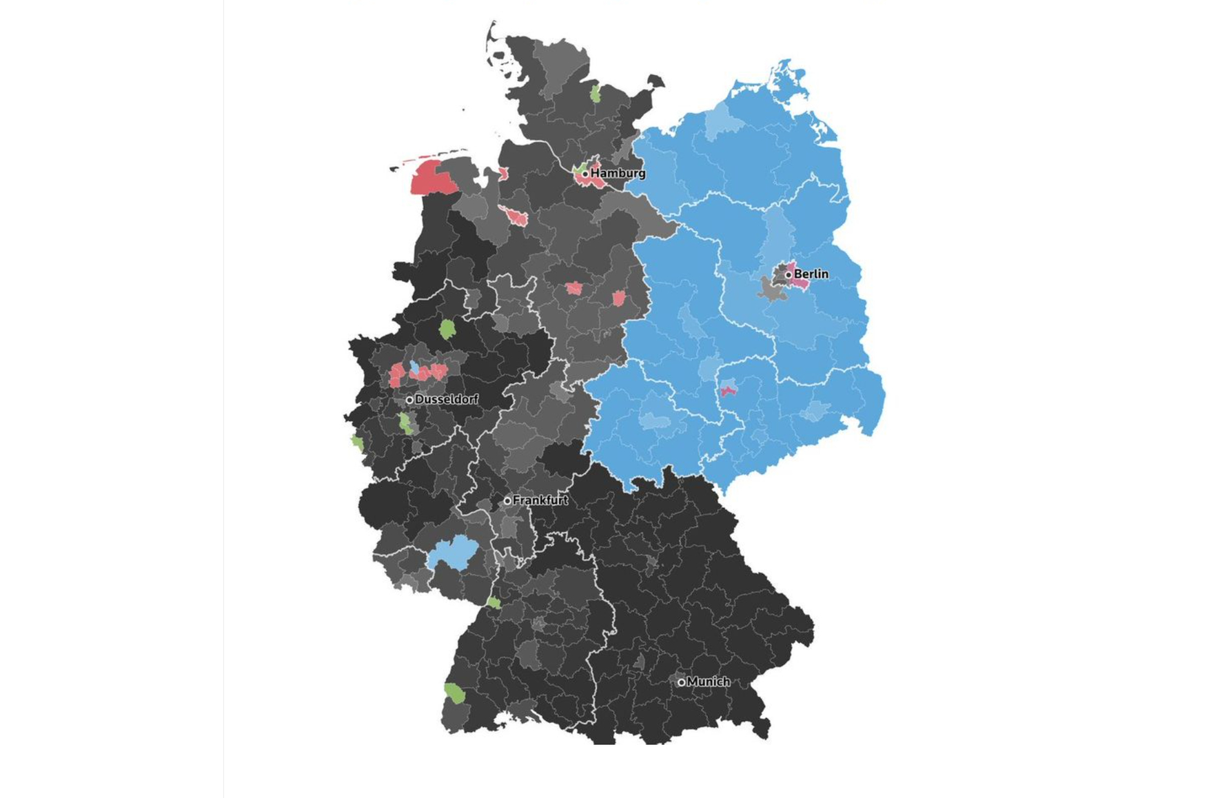 In all of former West Germany (except the small Saarland), the AfD failed to cross the 20% threshold, with its results ranging from 10% to 15% in Bremen and Hamburg. But its share in the east broke records, ranging from 32.5% in Brandenburg to an all-time high of 38.6% in Thuringia. Only the Christian Democrats and SPD of the euphoric, post-reunification 1990s could boast comparable numbers in the east of the country.