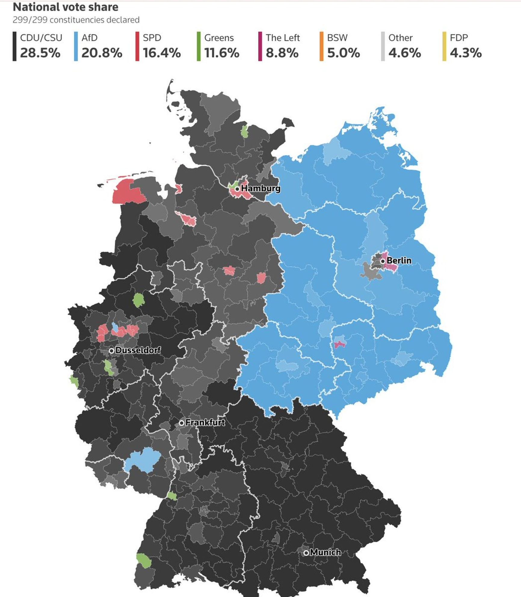 In the east, the AfD is breaking records, winning from 32.5% in Brandenburg to an all-time high of 38.6% in Thuringia