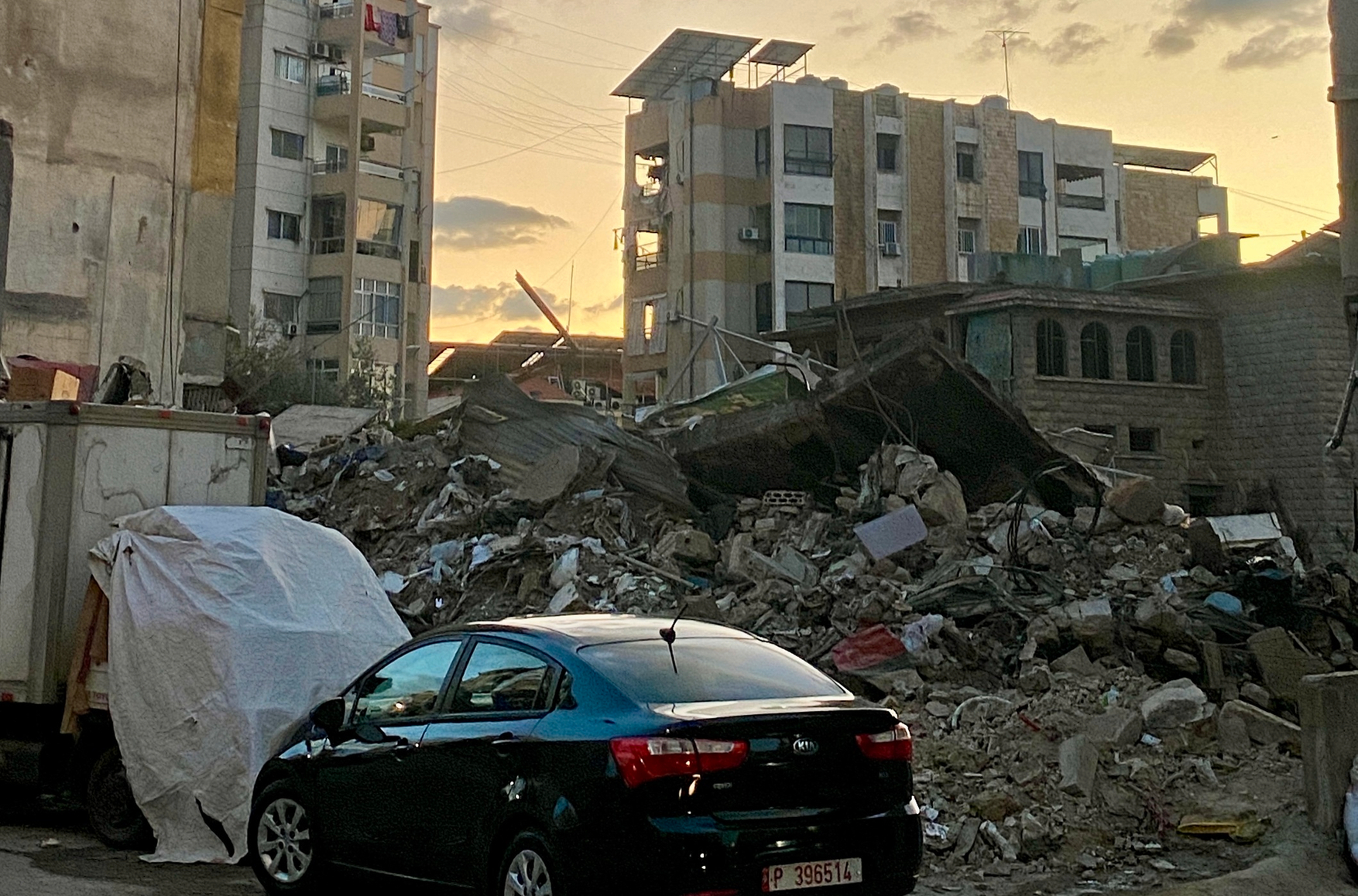Nasrallah Avenue is Haret Hreik's main thoroughfare. It looks as though every other building here has been hit. The poverty contrasts with the parked luxury cars, such as Lamborghinis and Ferraris. Stores, pizzerias, burger joints, and vegetable shops are open on the first floors.