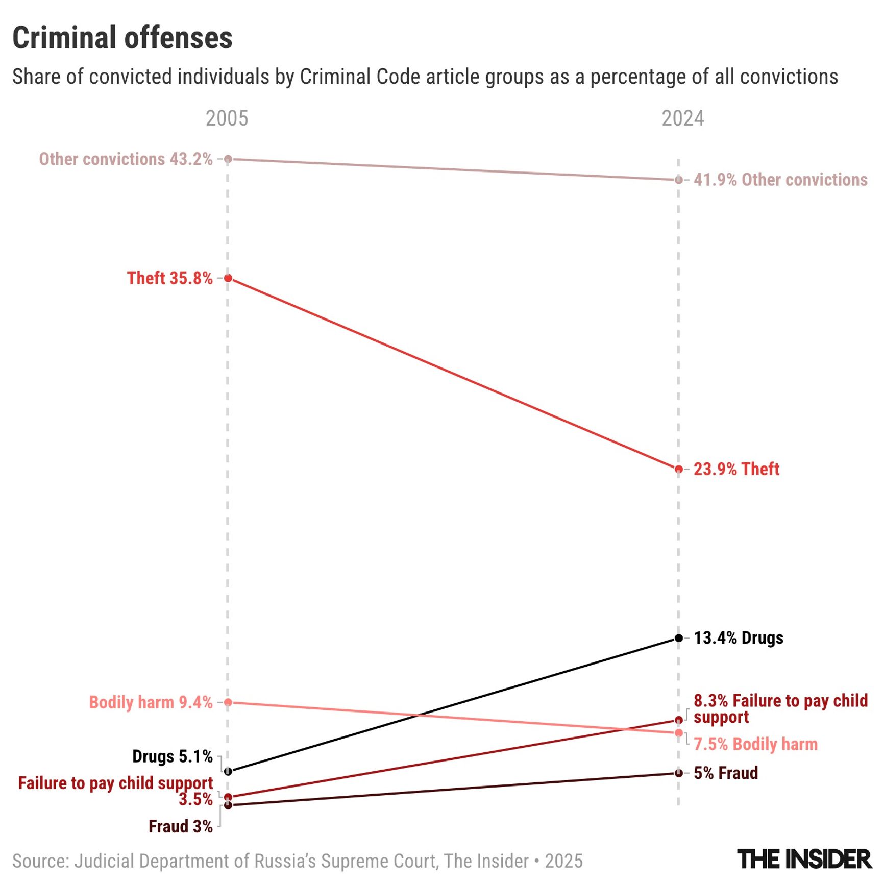 While the total number of criminal convictions in Russia has dropped 42% over the past 20 years — from 879,000 to 512,000 — drug convictions have steadily risen: from 40,000 in 2005 to 68,500 in 2024.