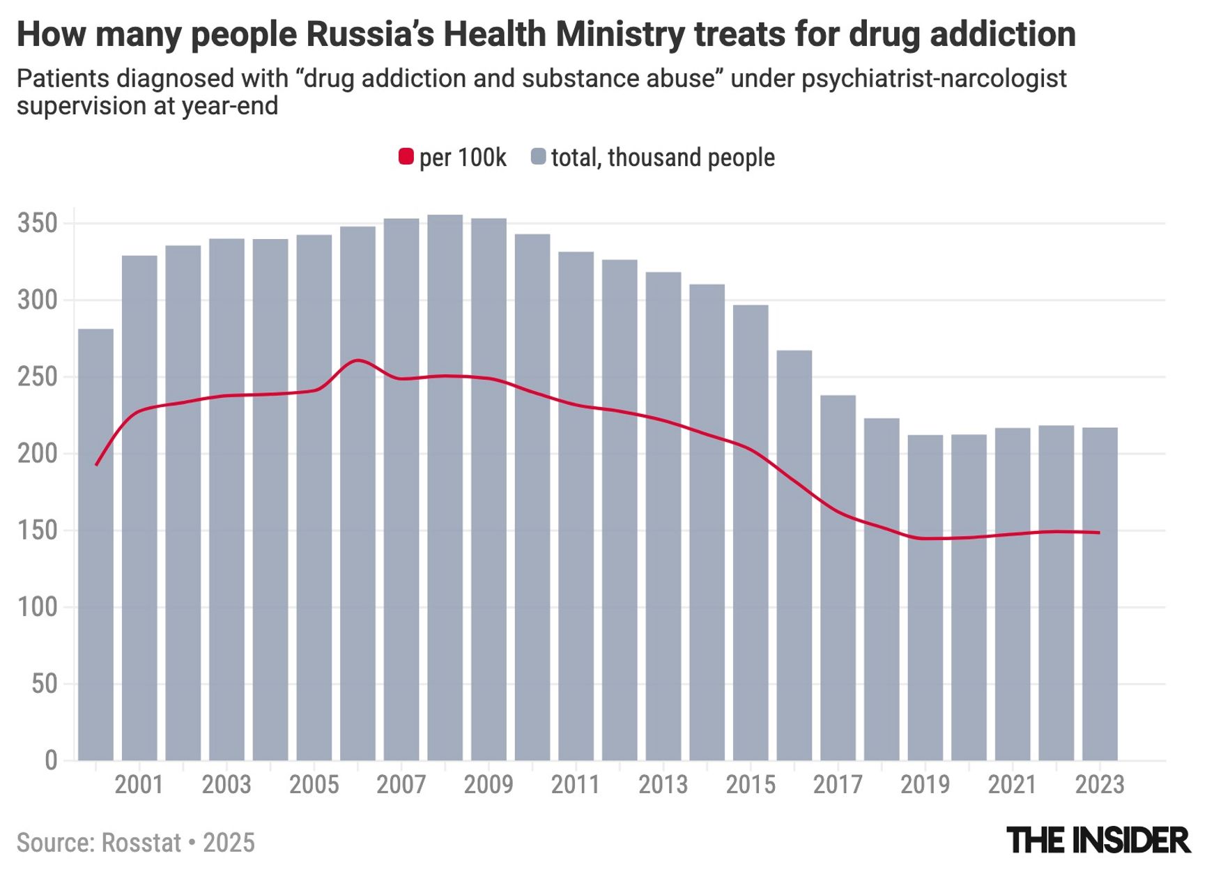 Rosstat data shows that over the past decade, the number of Russians officially registered with a diagnosis of “drug addiction or substance abuse” has declined by 30% — from 318,000 to 217,000, or 148.5 people per 100,000. The highest rate of officially registered drug users came in 2006, at 260.8 people per 100,000.