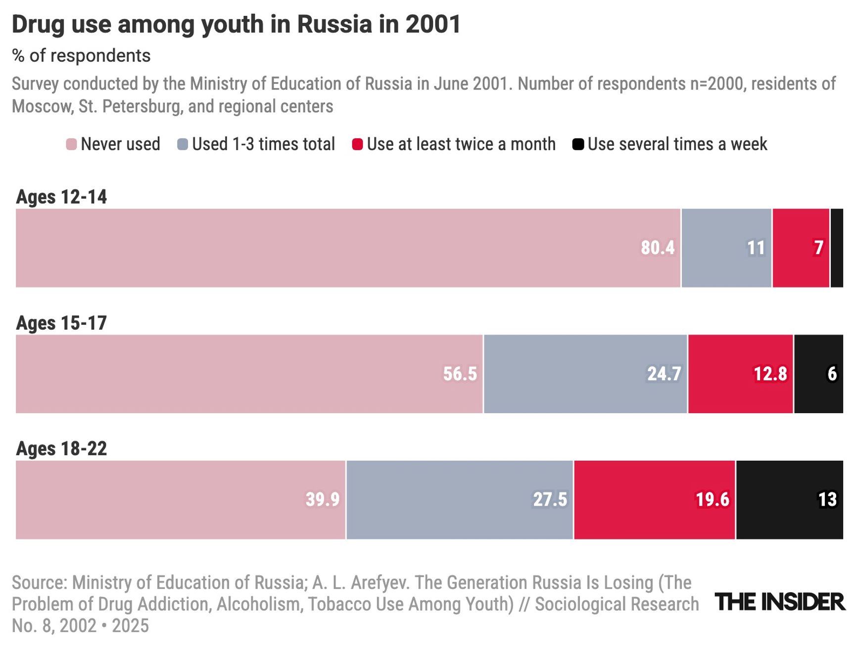 The scare stories that built Bryun’s career as Moscow’s — and eventually Russia’s — chief narcologist were not backed by data. According to a report by Russia’s State Statistics Committee (Goskomstat), in 1995 only 13 out of every 10,000 teens aged 15-17 actually used drugs. By 2000, the number rose to 22 per 10,000, or 0.2%. That’s 100 times less than the “one in five” figure Bryun claimed.