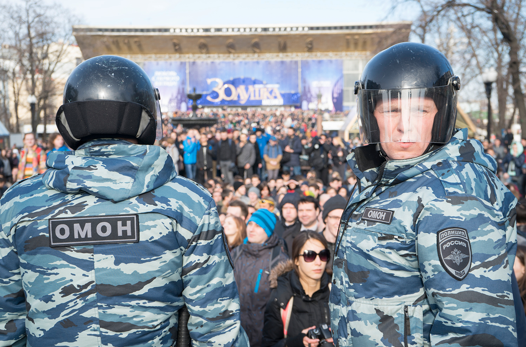 Полиция некоторое время пребывала в растерянности, но затем зачем-то начала битву за постамент. Бойцы «Росгвардии» в полной амуниции, бесстрашно расталкивая студентов и пенсионеров, прорывались в глубину толпы, скручивали кого-то попавшегося под руку и утаскивали в автобус: