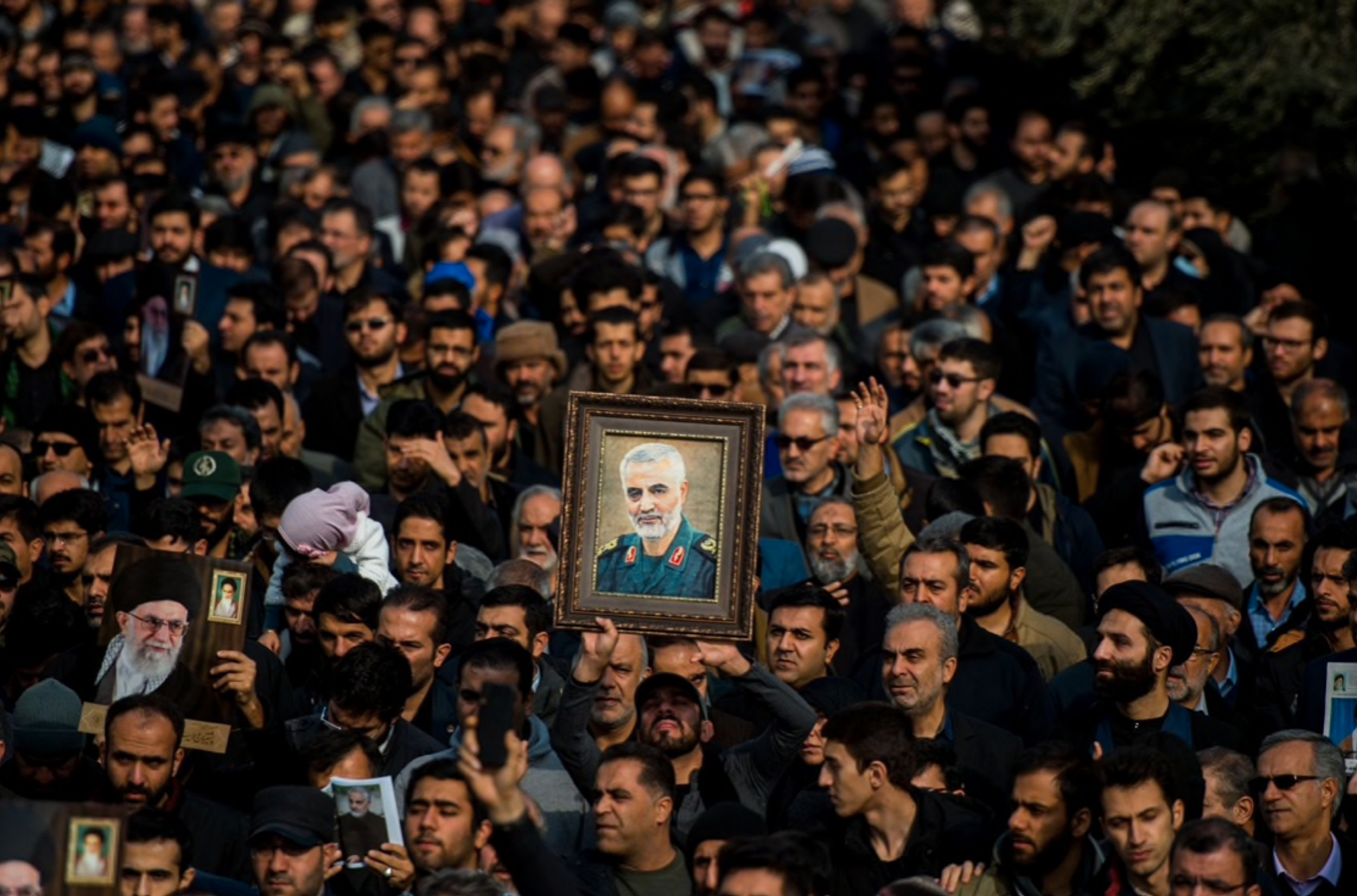 Люди несут портреты погибшего генерала, скандируют лозунги в поддержку шиитов Ирака, сжигают американские флаги и выкрикивают: «Ось зла — Америка!», «Смерть Америке!», «Смерть Израилю!».