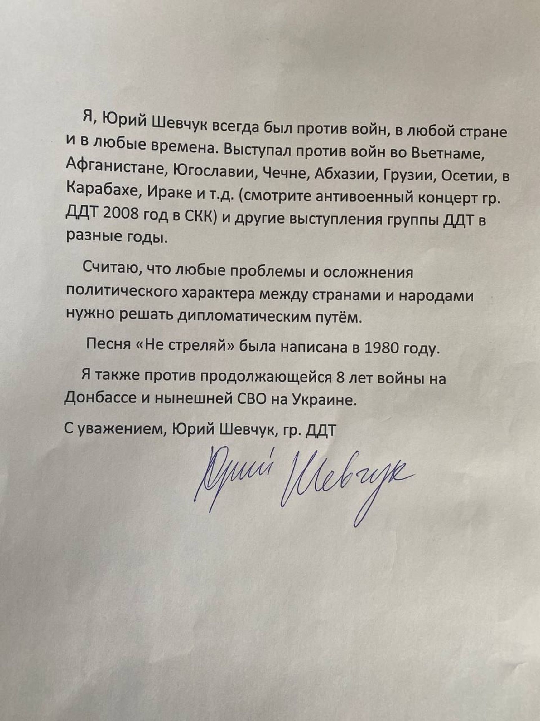 Музыканту назначили штраф в размере 50 тысяч рублей. Сам Шевчук на заседании суда не присутствовал. По просьбе Шевчука адвокат Александр Передрук огласил его позицию по делу. Правозащитник Чиков опубликовал текст заявления, в котором музыкант утверждает, что всегда был против войн и любые проблемы политического характера нужно решать дипломатическим путем. Шевчук также выступил против войны на Донбассе и «СВО» в Украине.
