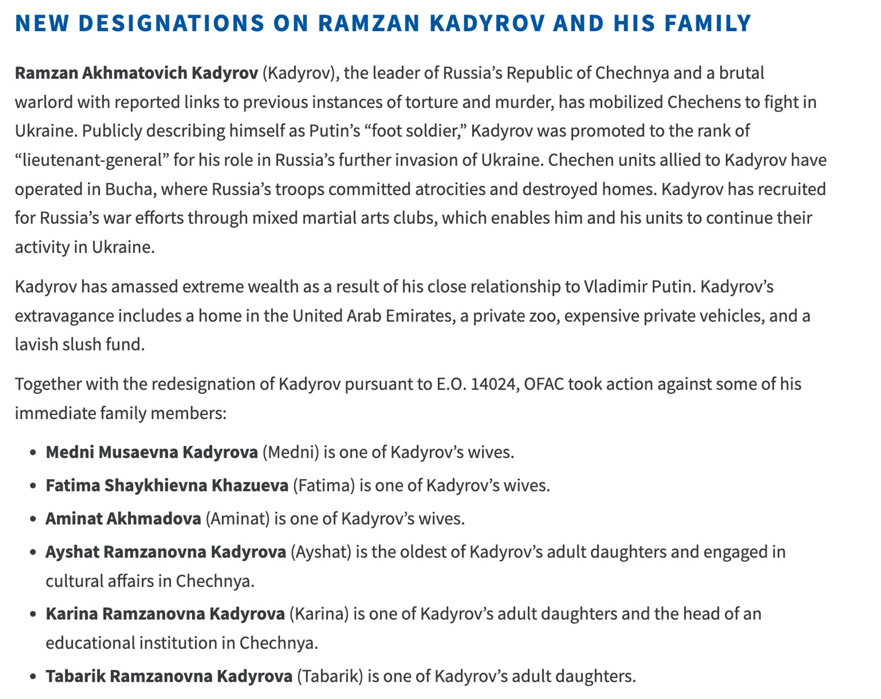 Кроме того, санкции введены против женщин, которых ведомство называет женами Кадырова, — Медни Мусаевна Кадырова, Фатима Шайхиевна Хазуева, Аминат Ахмадова. Также под санкции попали дочери главы Чечни — Айшат Кадырова, Карина Кадырова и Табарик Кадырова.