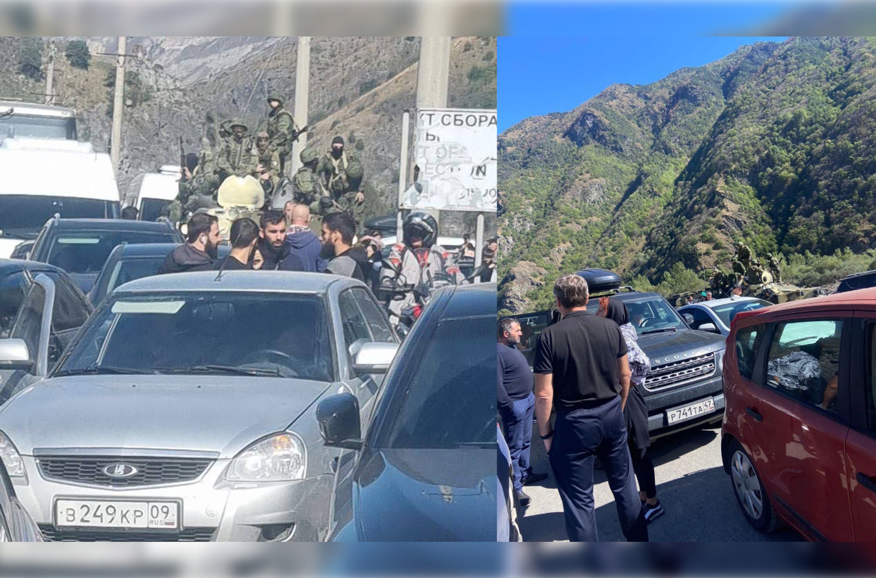 На КПП «Верхний Ларс» (Северная Осетия) к колонне автомобилей, пытающихся выехать из России, прибыл БТР с российскими военными. Об этом сообщил грузинский журналист Николай Левшиц. Фото с военными опубликовали многочисленные свидетели.