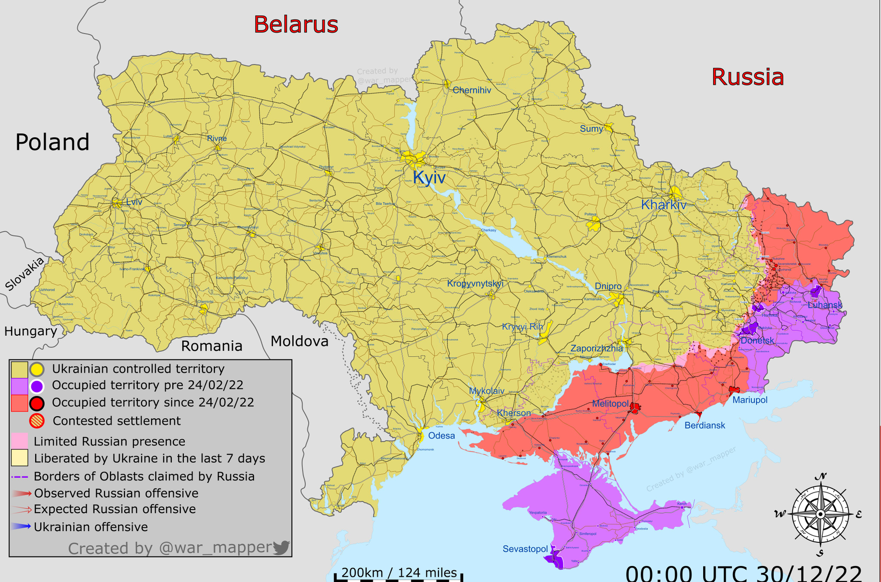 На Херсонском направлении российская сторона продолжает обстрел Херсона и правого берега Днепра, в то время как украинские партизаны и Силы специальных операций проводят разведывательные мероприятия на левом берегу. 30 декабря в Геническе в районе трасс Р-47 (Геническ — Новоалексеевка) и М-18 (Чонгар — Мелитополь) зафиксированы взрывы, сообщает Пфаффер.