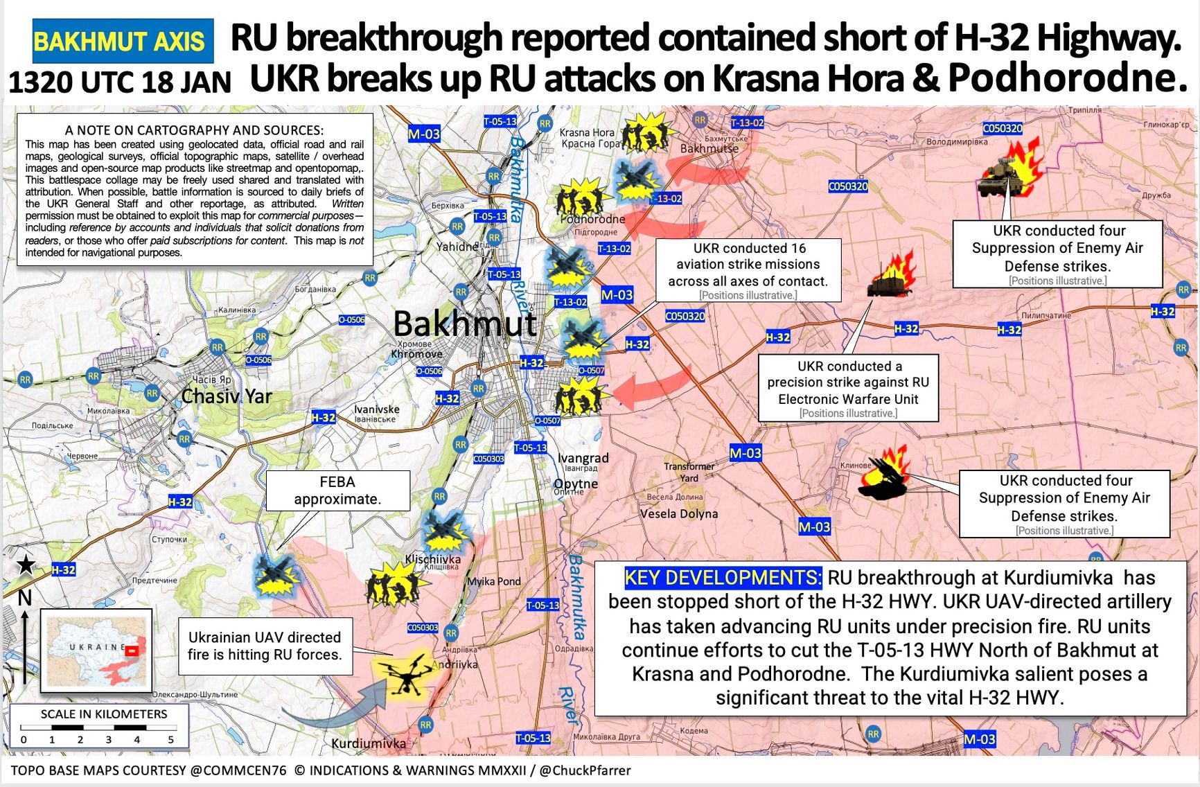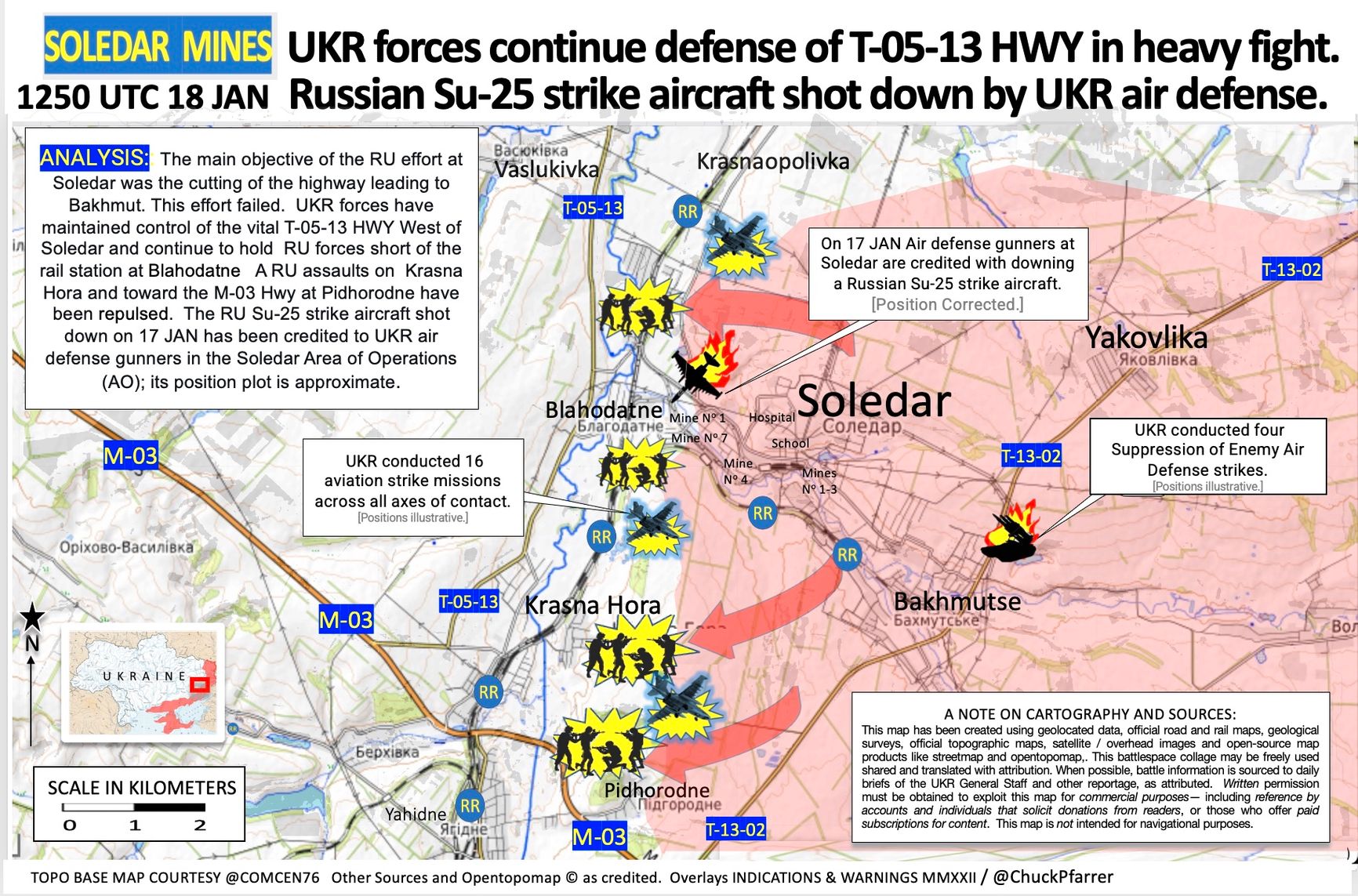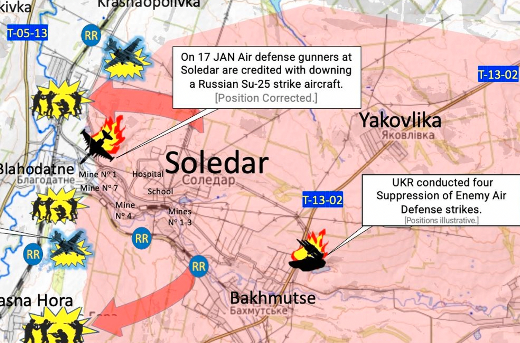 Пророссийские Telegram-каналы утверждают, что в настоящее время ЧВК Вагнера продолжает под прикрытием артиллерии вести штурмовые действия в районе Соледара. Сейчас акцент сместился на бои за Красную Гору и Парасковиевку, пишет эксперт пропагандистского Центра военно-политической журналистики Борис Рожин. Бывший военнослужащий ВМС США Чак Пфаррер считает, что основной целью действий России в Соледаре было перерезание Бахмутского шоссе, но им это не удалось. При этом украинские силы сохраняют контроль над важной трассой Т-05-13 к западу от Соледара и продолжают удерживать российскую группировку за пределами железнодорожной станции в Благодатном. Пфаррер также опубликовал карту.