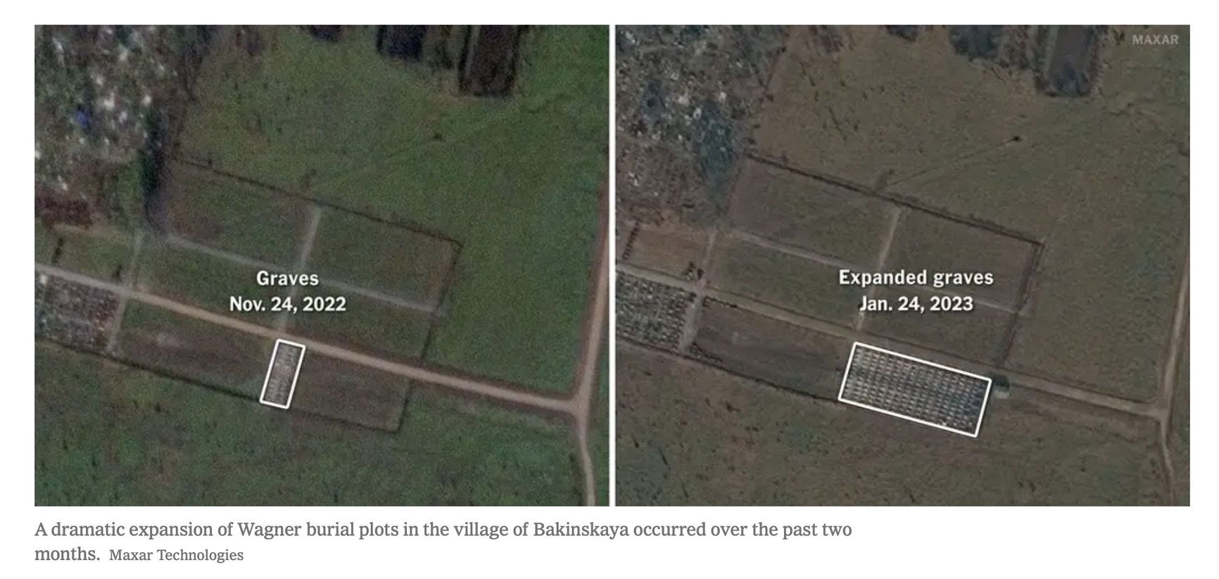 На кладбище в станице Бакинская Краснодарского края, где хоронят погибших в Украине бойцов ЧВК Вагнера, число могил выросло в семь раз за последние два месяца. Об этом свидетельствуют спутниковые снимки, опубликованные The New York Times.
