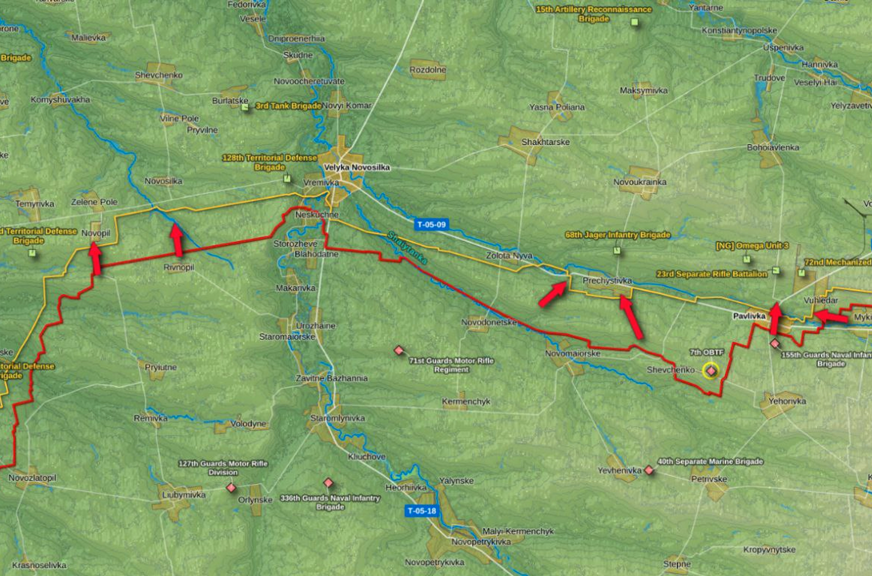 На Запорожском направлении, по данным War Gonzo, российская артиллерия обстреливает Новоандреевку, Орехов, Новоданиловку, Малую Токмачку, Гуляйполе, Красное и Степное. На Донецком направлении продолжаются встречные бои в городской черте Марьинки. Чуть юго-восточнее ВСУ нанесли артиллерийский удар по Александровке. Российские войска обстреляли Георгиевку и укрепрайоны украинской армии в Красногоровке и Марьинке.