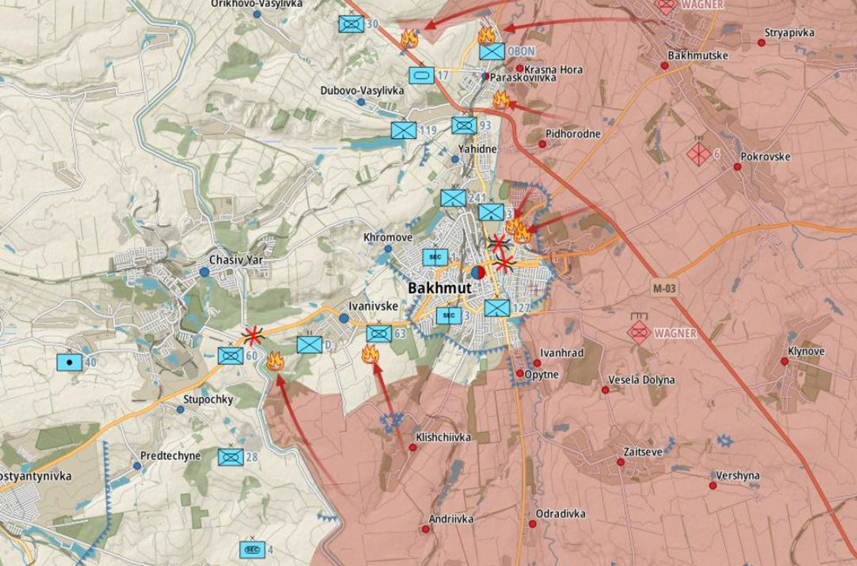 13 февраля Минобороны России сообщило о захвате поселка городского типа Красная Гора под Бахмутом. Днем ранее об этом заявлял основатель ЧВК Вагнера Евгений Пригожин. ВСУ потерю Красной Горы отрицают: представитель Восточной группировки войск Сергей Череватый заявил CNN, что бои продолжаются и населенный пункт остается под контролем украинских сил.