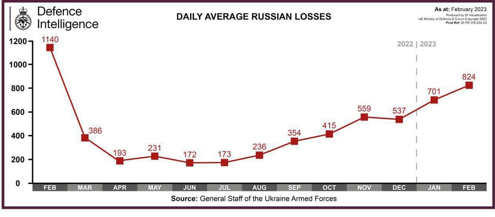 В последние две недели российская армия, вероятно, несет самые большие потери с первой недели полномасштабного вторжения в Украину, сообщило 12 февраля Минобороны Великобритании. Ведомство подчеркивает, что не может подтвердить конкретные цифры, которые приводит Генштаб ВСУ, но отмечает тенденцию к заметному росту потерь. По данным украинского Генштаба, в течение последней недели потери России составляют в среднем 824 человека в сутки. Это более чем в четыре раза превышает потери, которые российская армия несла в июне-июле.