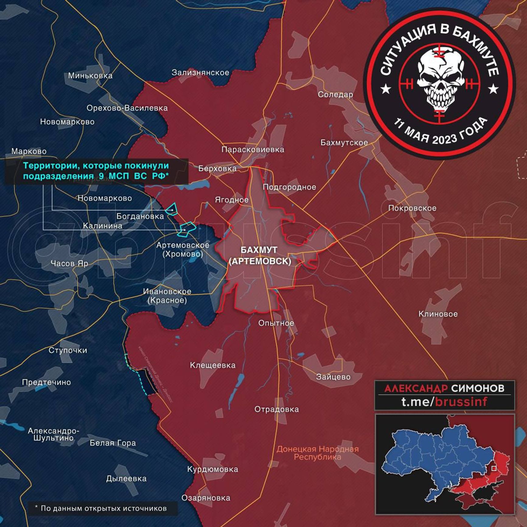 Связанный с ЧВК Вагнера «военкор» Александр Симонов пишет о продвижении украинских войск к северу и к югу от Бахмута. По его данным, подразделения 9-го мотострелкового полка ВС РФ отошли на глубину 600 метров, чем разблокировали для ВСУ дорогу Часов Яр — Бахмут. А подразделения 4-й отдельной мотострелковой бригады оставили территорию к юго-западу от Ивановского площадью до 3,5 км² и позиции к северо-западу от Клещеевки (вместе с бойцами 374-го отдельного мотострелкового батальона).