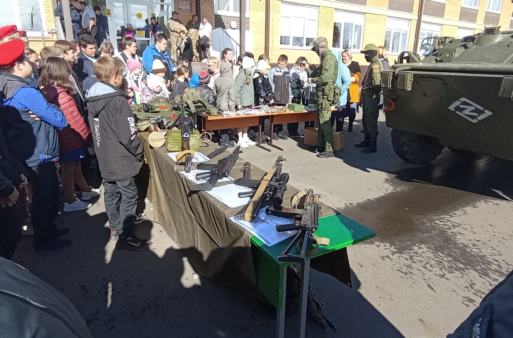 Курским школьникам для воспитания патриотизма во время «Урока мужества» показали БТР и оружие. Проводить урок в Черновецкую среднюю школу приехали участники войны в Украине. Они привезли дрон, военный грузовик, набор питания «Армия России», амуницию, камуфляжную форму, гранатометы, пулемет и другое оружие.