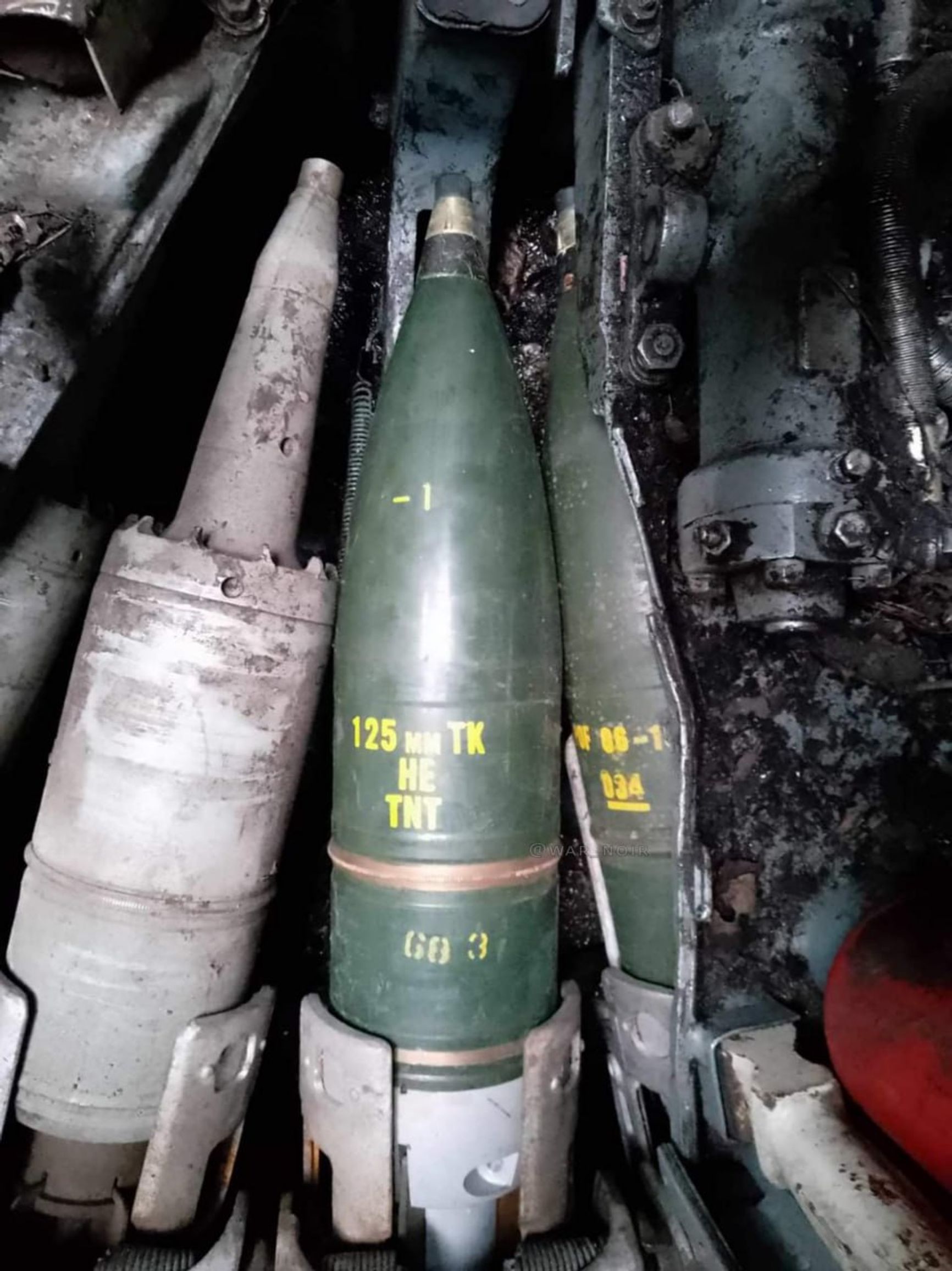«Военный Осведомитель» публикует фото пакистанских 125-мм осколочно-фугасных снарядов HE FS TK производства Pakistan Ordnance Factories, обнаруженных в боекомплекте украинского танка.