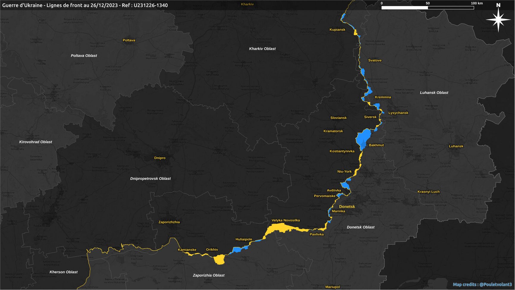 Исследователь под ником Poulet volant приводит в соцсети X карту итогов года (и цифры, отличающиеся от данных DeepState). Как несложно заметить, основные территориальные успехи ВС РФ связаны с зимне-весенним наступлением в начале года, а текущие наступательные операции пока нигде не привели к существенному продвижению.