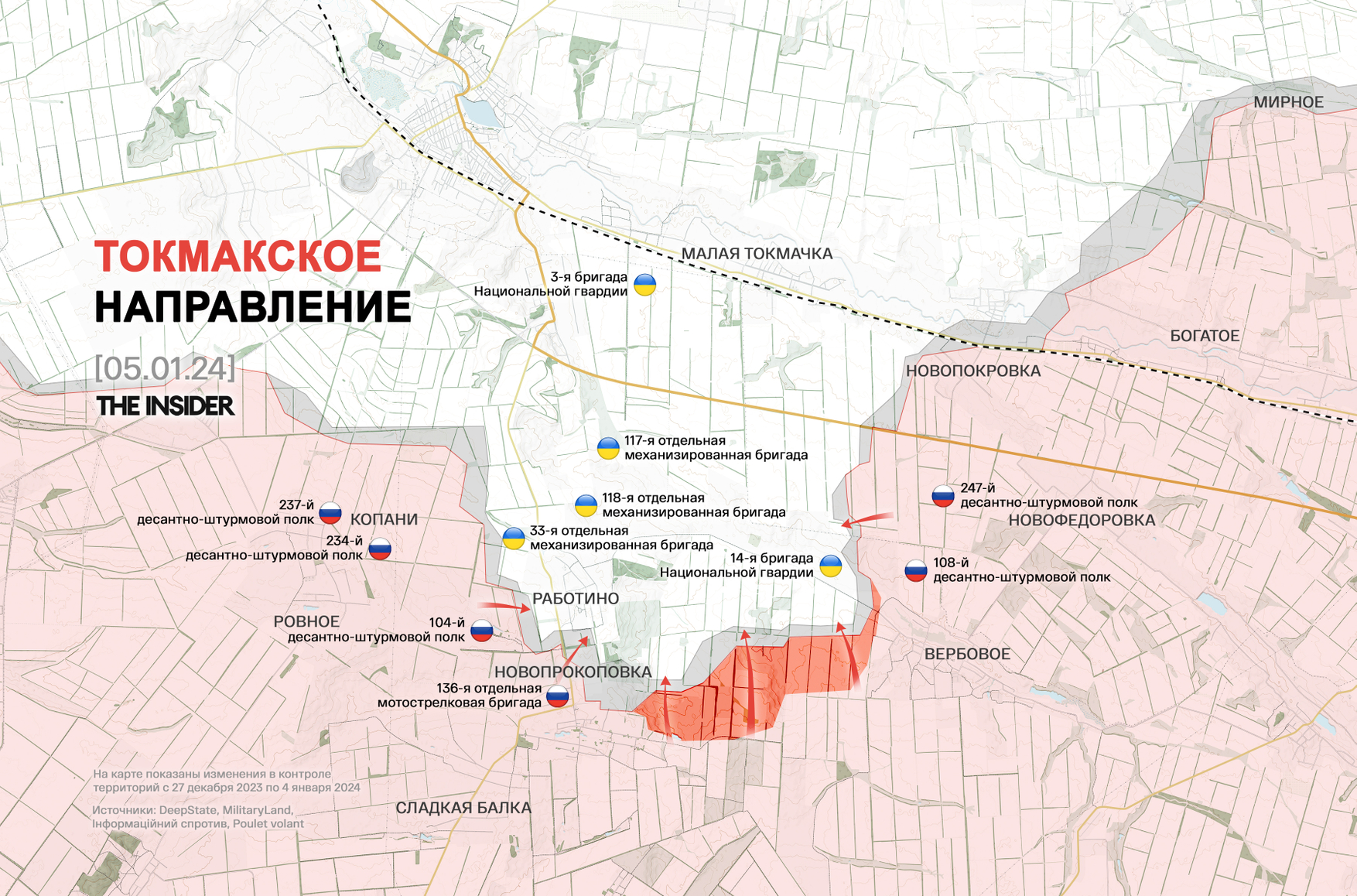 Согласно сводке DeepState за 3 января, россияне на сватовском направлении безуспешно пытаются атаковать Синьковку и Ольшаны, восточнее Тернов также идут бои. На бахмутском направлении ВС РФ удалось продвинуться в районе Хромово, Богдановки и Андреевки, тогда как российские атаки в районе высот близ Клещеевки удалось отбить.