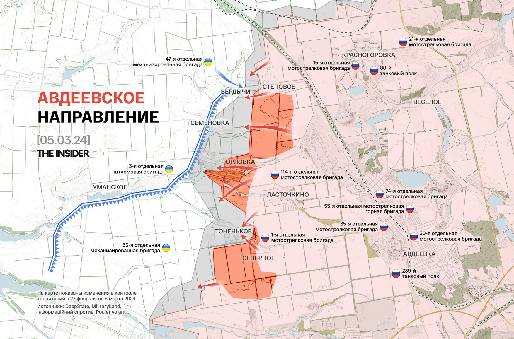 • Наступление ВС РФ на авдеевском направлении уперлось в рубеж обороны по линии Бердычи — Орловка — Тоненькое;