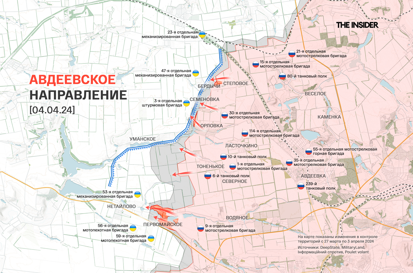 DeepState признает продвижение ВС РФ в Бердычах на рубеже обороны к западу от Авдеевки. По оценке WarGonzo, бои идут на окраинах Бердычей и Семёновки, в районе Тоненького российские войска угрожают выйти на подступы к Уманскому. Также авторы проекта WarGonzo пишут о тяжелом положении украинского гарнизона в Новомихайловке, тактических успехах в Георгиевке и ожесточенных боях в Первомайском.