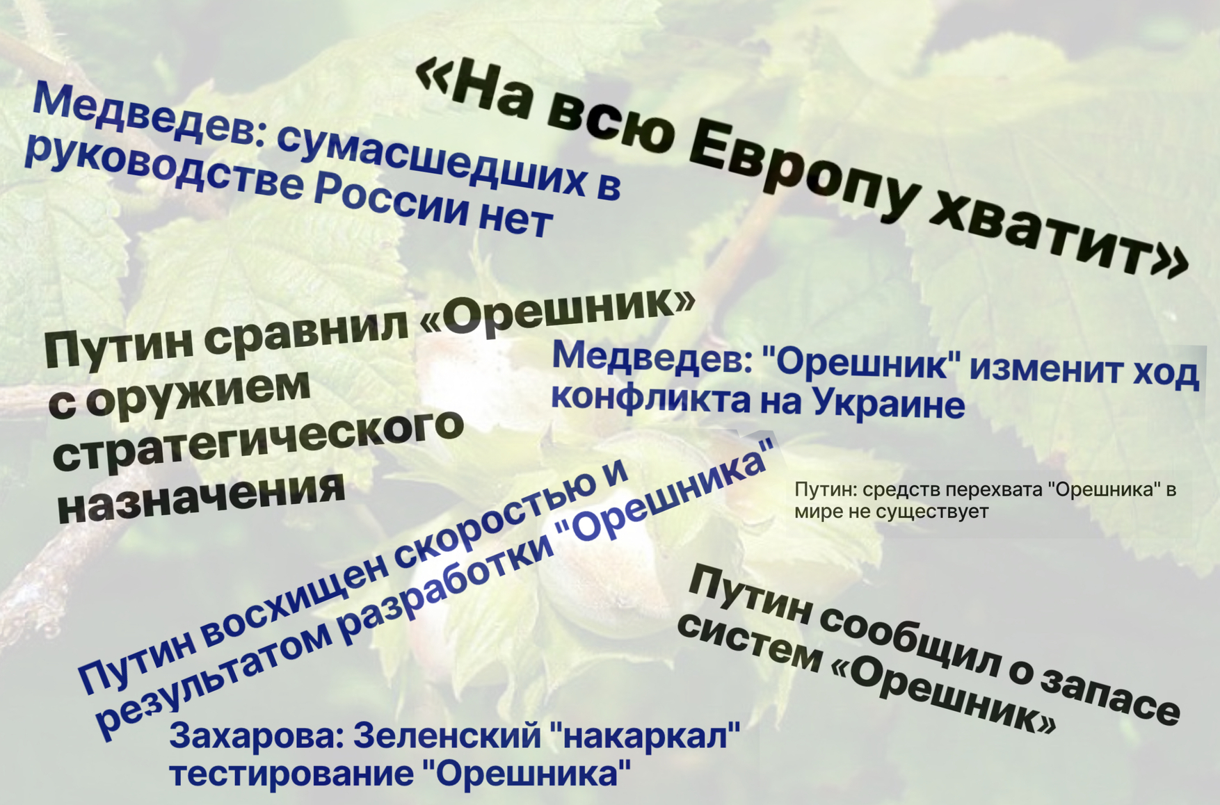 Путин второй день продолжает говорить об «Орешнике» — одной из «новейших», по его словам, российских ракетных систем средней дальности с баллистической ракетой в «безъядерном гиперзвуковом оснащении». Эксперты сразу обратили внимание на то, что никакого «гиперзвукового оснащения» у ракет не бывает - они либо являются таковыми, либо не являются. «Орешник» такой ракетой не является, так как не способен маневрировать на гиперзвуковой скорости, а значит является обычной баллистической ракетой. Путин также заявил, что «запасы “Орешника” у России уже имеются», и разрабатывали его якобы с 2023 года. По его словам, эффект от массированного применения «Орешника» «будет сопоставим с эффектом от оружия стратегического назначения». В действительности же эта ракета не является ни новой разработкой (это модификация старой ракеты), ни подходящим для массированного применения вооружением (слишком дорогая и неточная), пояснил The Insider военный обозреватель Сергей Ауслендер.