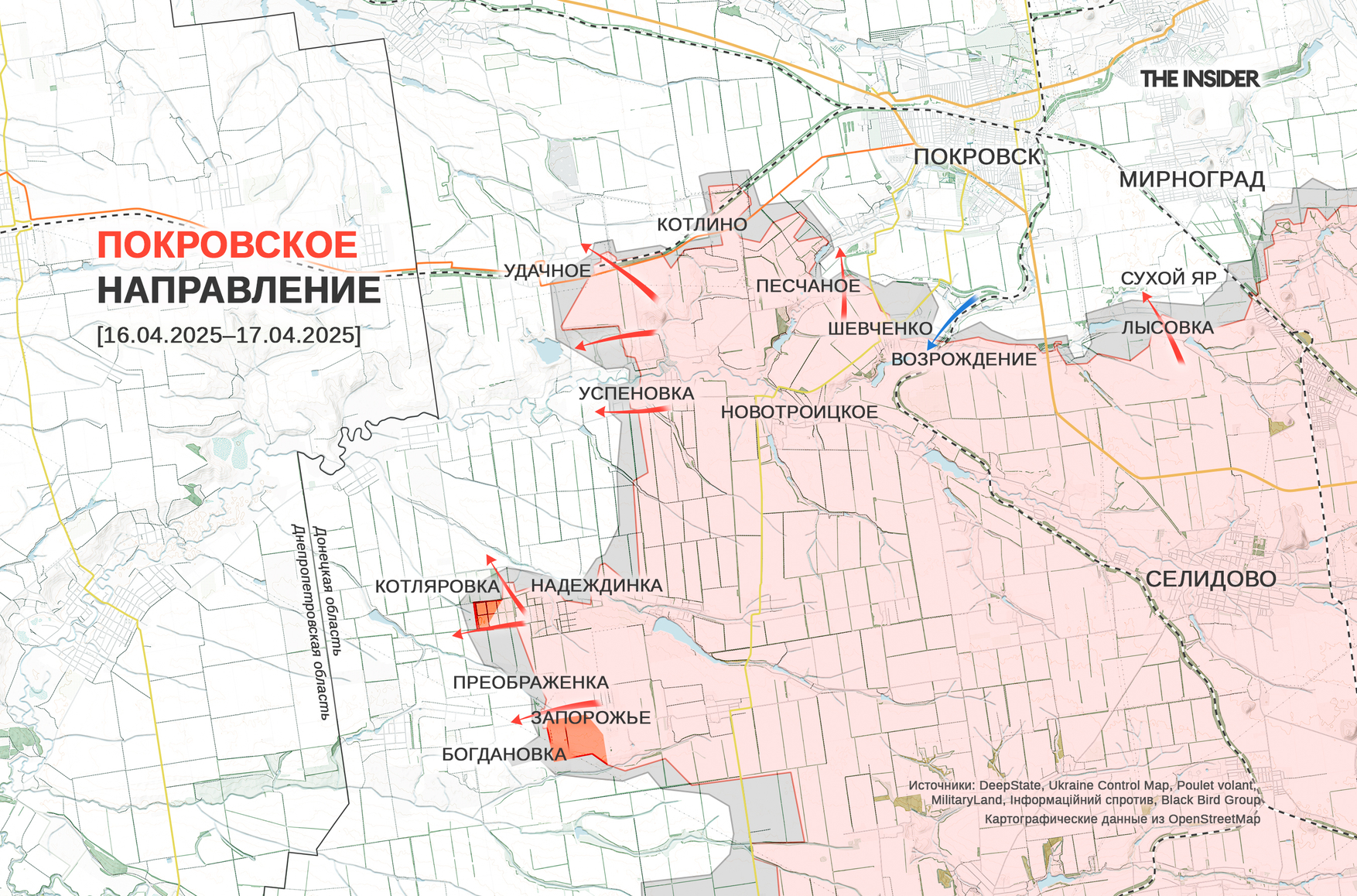 DeepState фиксирует продвижение ВС РФ возле Котляровки и Запорожья. Со своей стороны Минобороны РФ отчиталось о захвате Преображенки к юго-западу от Покровска (до 2016 года — Красноармейск).