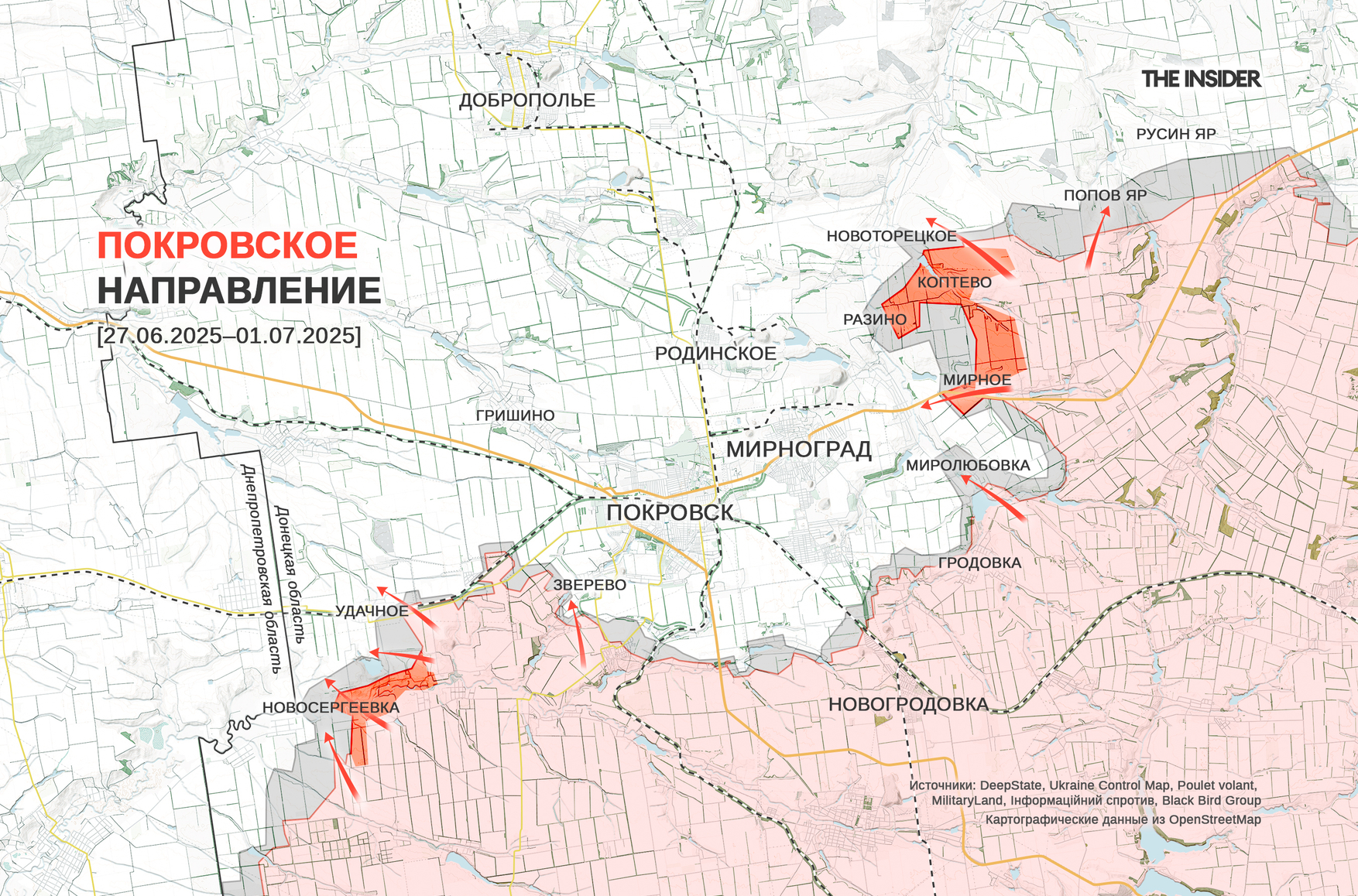 DeepState сообщает о продвижении российских войск на правом и левом флангах направления: около Новосергеевки к юго-западу от Покровска и рядом с Мирным и Разиным к северо-востоку от Мирнограда. Также признается полный захват Коптева на восточном фланге. Таким образом текущая ЛБС в районе Покровска и Мирнограда окончательно сформировалась в виде «дуги» с двумя фланговыми полуохватами.