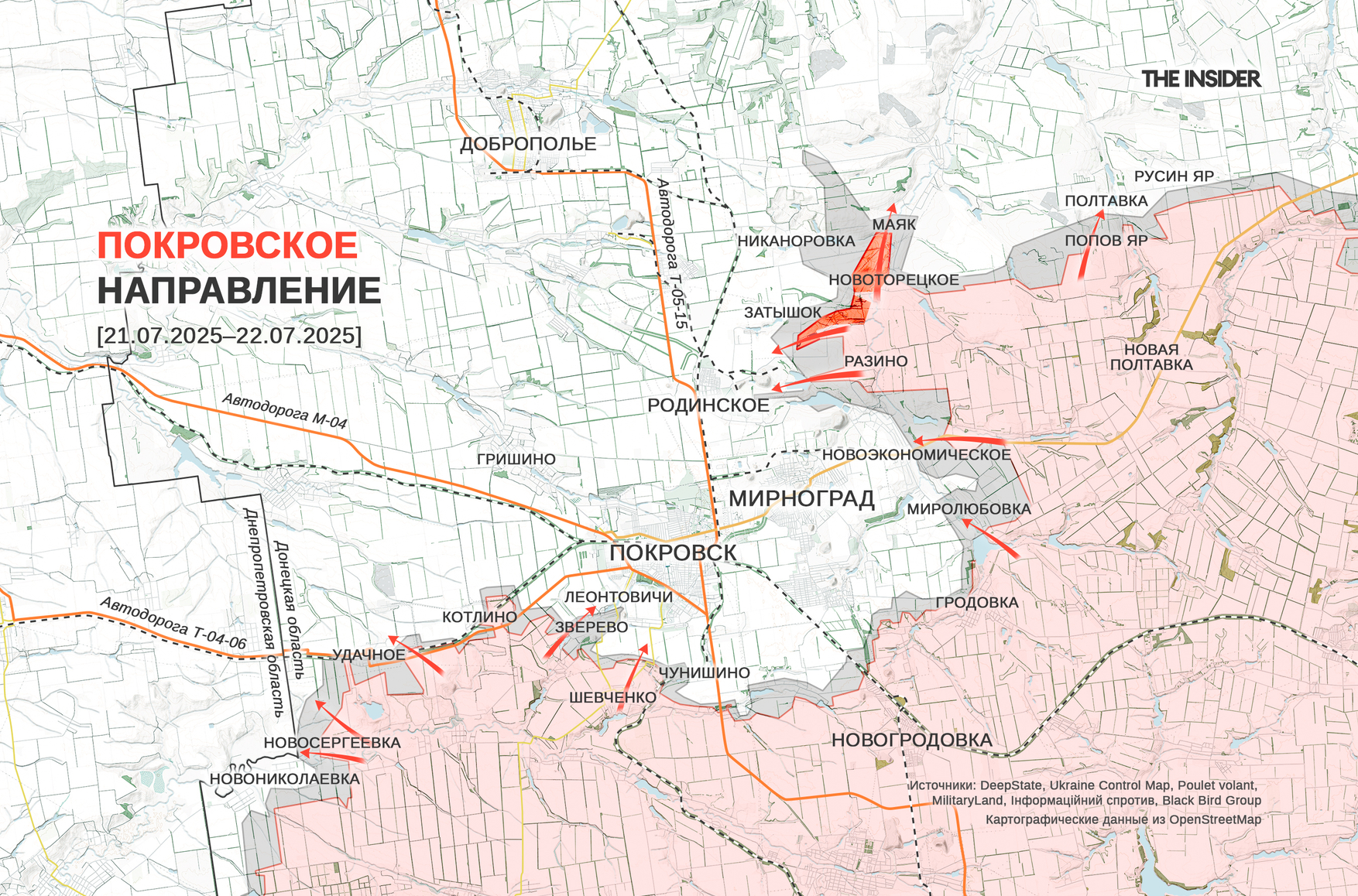 Юрий Котенок пишет о боях в Удачном и Котлине (до 2016 года — Димитрово) к юго-западу от Покровска и «зачистке» восточной части Зверева к югу от города. Также он сообщает о захвате большей части Леонтовичей, боях за Чунишино и Новоукраинку и прорыве российских штурмовых групп в южную часть Покровска со стороны Бельгийки. «Военкор» делает вывод, что российские войска «приступили к штурму Красноармейско-Димитровской агломерации практически на всём протяжении ЛБС».