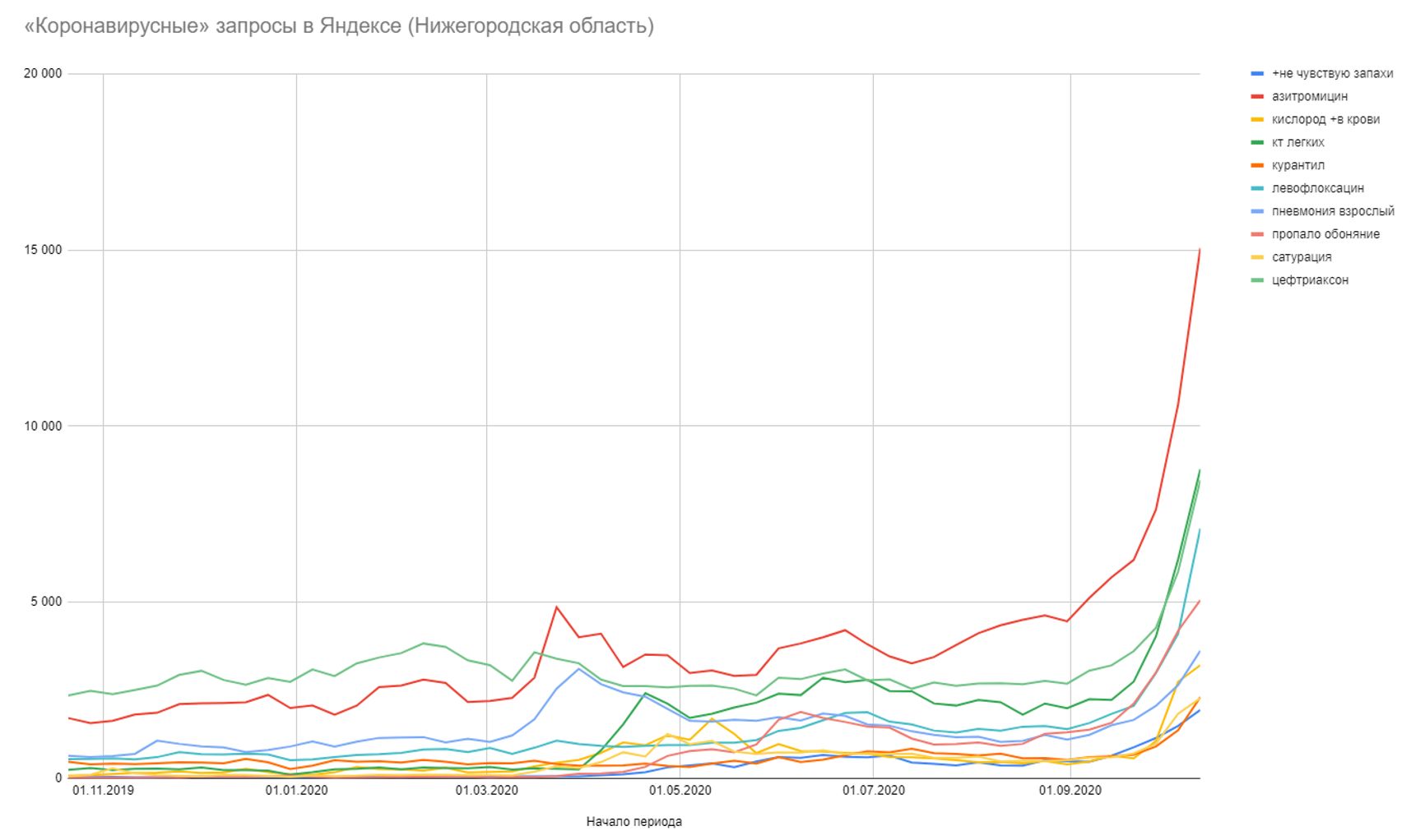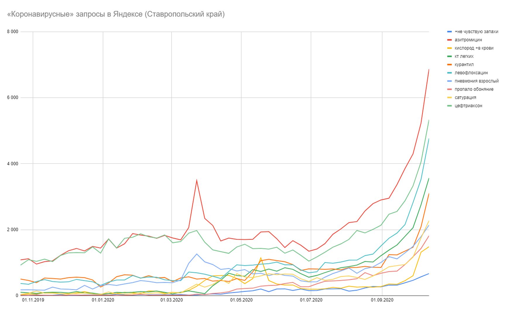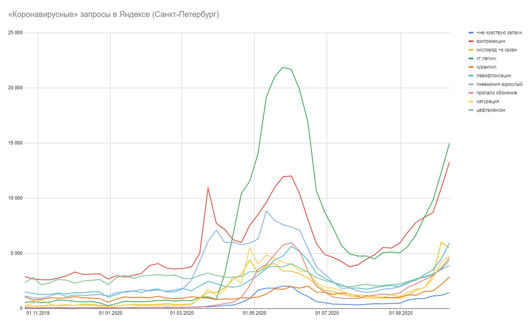 «Пропало обоняние» — запрос не медийный: его популярность не зависит от активности СМИ, и он растёт непрерывно на протяжении 2 месяцев — тогда как медийные запросы дают разовый пик, который за одну-две недели спадает. Кроме него, растут и другие специфические запросы, и коэффициент корреляции этих запросов с «пропало обоняние» — от 0,9 до 0,995. И у всех — общий тренд.