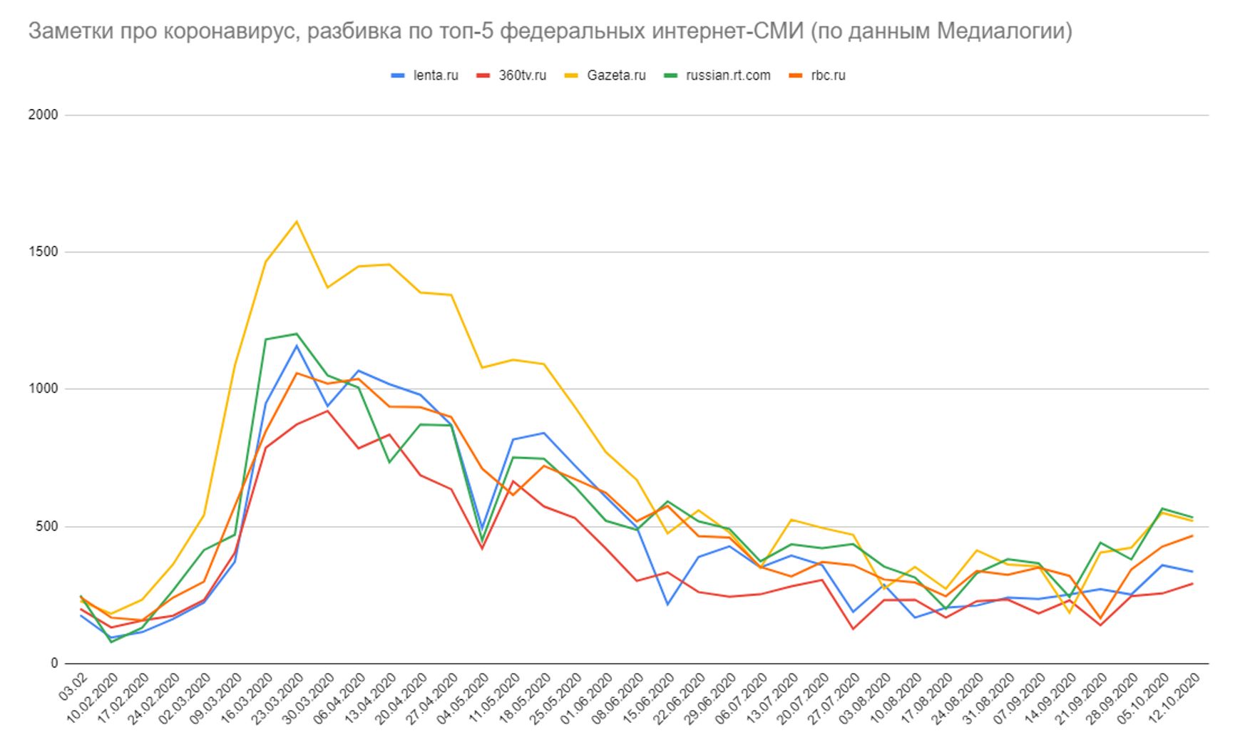 Пик интереса приходится на вторую половину марта — именно тогда коронавирус становится главной федеральной повесткой, создаётся специальная рабочая группа Госсовета, Путин посещает Коммунарку и впервые обращается к россиянам. Далее объявляется «нерабочий месяц», Россия уходит на карантин, СМИ публикуют тысячи заметок про коронавирус — а с окончанием «нерабочих дней» резко теряют к нему интерес.