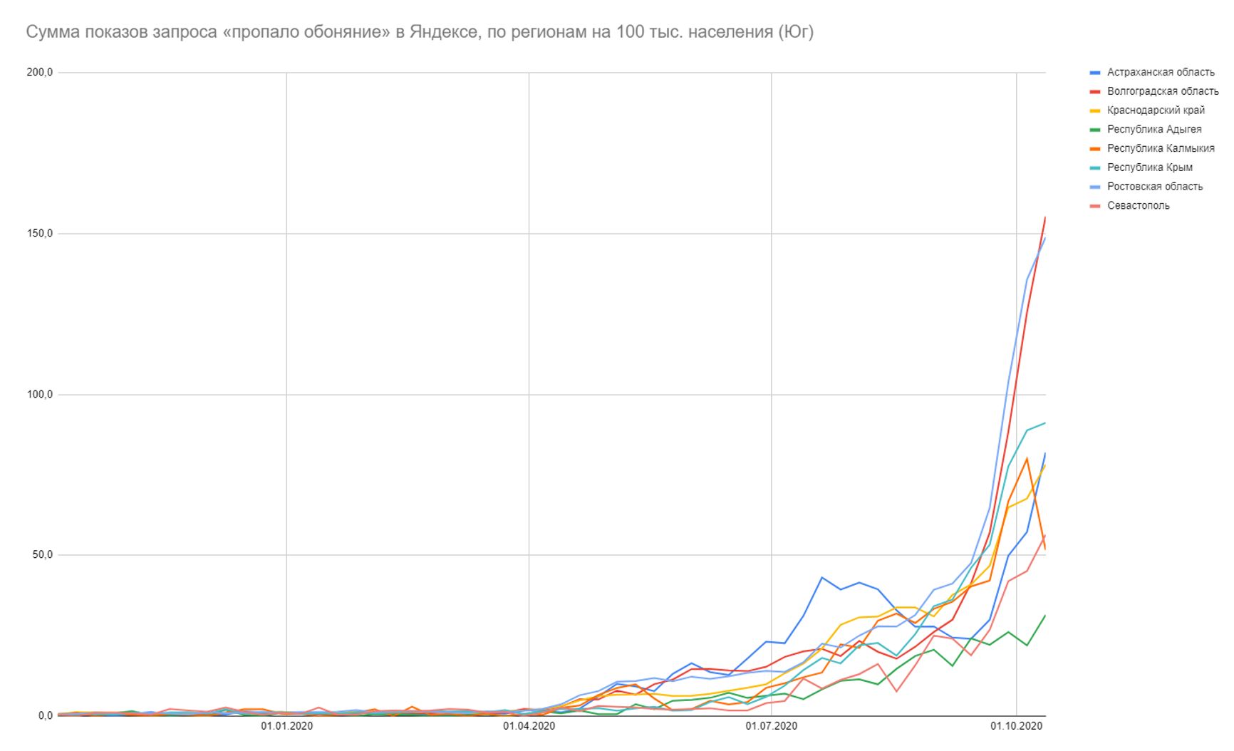Это катастрофический рост. Если с мая по сентябрь запрос держался в пределах 27−43 тыс. показов в неделю и постепенно снижался, то с конца августа вновь начал расти, и расти по экспоненте (R² 0,998) — и достиг 170 тыс. показов в неделю (последняя неделя, за которую доступны данные, — 12−18 октября). Это больше, чем в любой из весенних и летних месяцев, выше весенне-летних пиков в 4 раза и выше стандартного сезонного уровня в 140 раз. И это не накрутка, не медиашум и не массовый психоз — так выглядит волна эпидемии, которая одновременно накрыла большую часть страны.