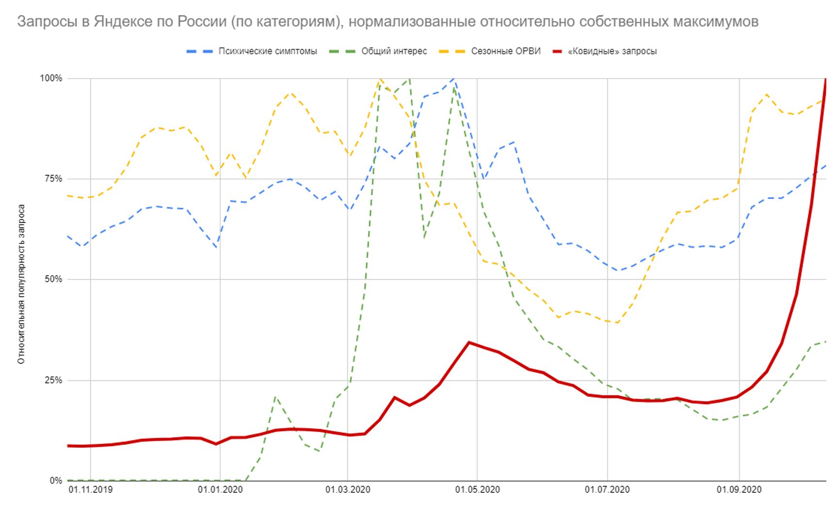 Уже в конце апреля такие запросы начинают падать — синхронно со снижением активности СМИ и уменьшением общего интереса к ковиду — в конце мая выходят на свой доковидный уровень, а к середине лета достигают минимума. С началом сентября — по мере того как наступает вторая волна, а про коронавирус снова начинают чаще писать СМИ, — число таких запросов растет. Но и сегодня он ниже уровня марта и середины мая. Уровень этих запросов также коррелирует с активностью СМИ: чем больше новостей и статей про коронавирус — тем выше тревожность и больше поисков (коэффициент корреляции с начала марта по середину октября — 0,805). Поэтому дело не в панике и не в массовом психозе. СМИ и их нагнетание, по-видимому, действительно приводит к росту тревожности — но к «коронавирусным» запросам это не имеет никакого отношения. Для наглядности — так соотносятся разные группы запросов. Здесь видно, что у «коронавирусных» запросов — своя особая динамика: