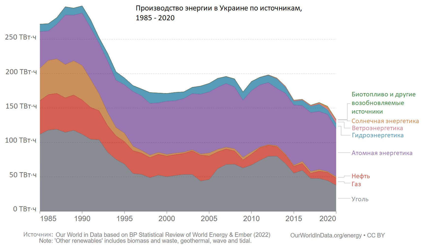 Энергосистеме поможет выстоять и переизбыток мощностей, оставшихся с советского периода. На пике они производили более 300 млрд киловатт-часов, что позволяло обеспечивать энергией военно-промышленный комплекс СССР. Сейчас такой потребности нет. За последние 30 лет после развала СССР потребление электроэнергии в Украине снизилось почти в 2,5 раза. Но мощности остались, и страна не испытывает недостатка в выработке электроэнергии.